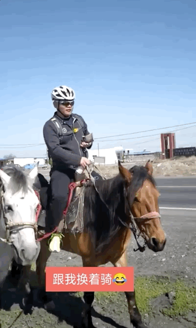 🟧 閔德華與自行車主人交換“坐騎”。圖源@閔德華騎馬去北京