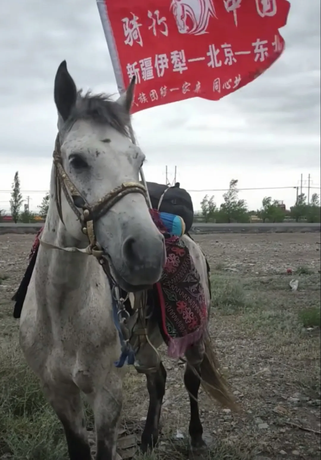 出發時,閔德華是個困惑的年輕人,陪他上路的是兩匹馬和東拼西湊來的五萬塊錢。父母、妻子不理解他的想法,只有一面旗給他壯行,紅底白字印着“騎行中國 新疆伊犁-北京-東北”。