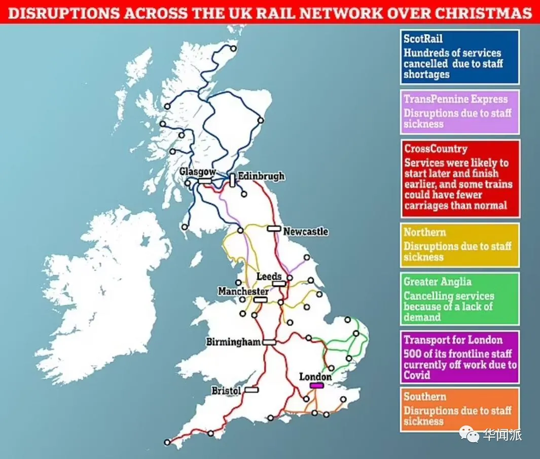 北方鐵路公司(Northern Rail)、斯考特雷爾鐵路公司(ScotRail)和TransPennine快運公司都表示,由於人員短缺,不少線路的服務中斷。