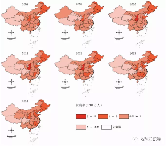 (圖:中國大陸2004—2015年腎綜合徵出血熱的時空分佈)▼