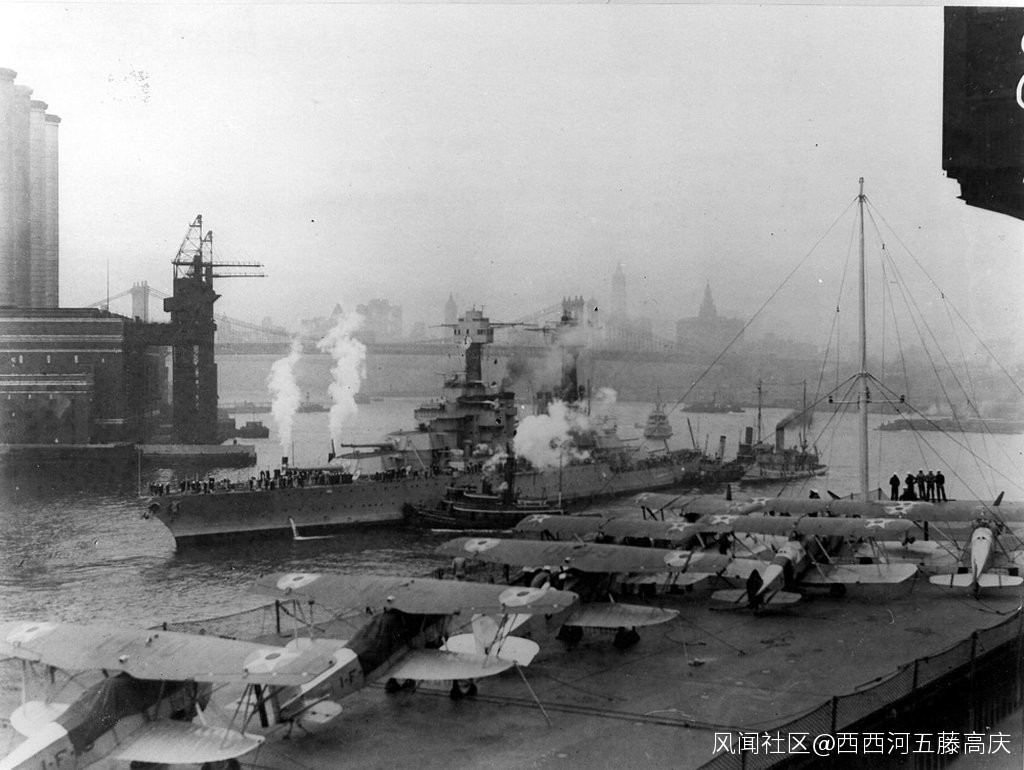 造艦的最高潮是田納西級之後的3艘科羅拉多級戰列艦,該級軍艦裝有8門16英寸大炮,電推電壓提高到5000伏特,但動力仍保持在3萬馬力,航速只有21節,美國海軍的考慮是本國其他的無畏艦都只能跑到21節,所以新船也沒必要開得更快。到這時美國一共建造了6艘電推戰列艦:一艘新墨西哥號、兩艘田納西級、三艘科羅拉多級。下圖是1927年科羅拉多級三號艦西弗吉尼亞號來到當時在苟延殘喘的布魯克林造船廠整修,霧霾很厲害,依稀可見遠處的布魯克林大橋: