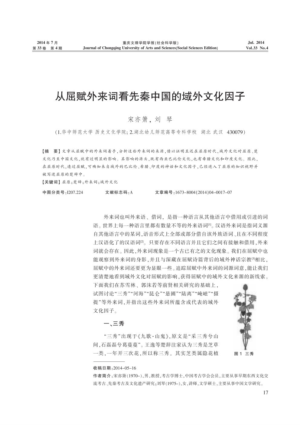 標題:從屈賦外來詞看先秦中國的域外文化因子;轉自《重慶文理學院學報(社會科學版)》2014年的第4期(即那一年7月份出版的那一期)