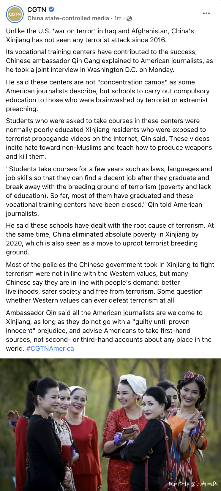 **美媒問:**我很尊重秦大使和中國人民,但同時作為記者,表達質疑是我的工作。**為什麼西方記者不能進入新疆“集中營”與裏面的人交談?**促進相互理解的最好方式就是講述真相併被報道。我希望今年有機會去新疆“集中營”看看,與穆斯林民眾交談,聽聽他們的故事。可以嗎?