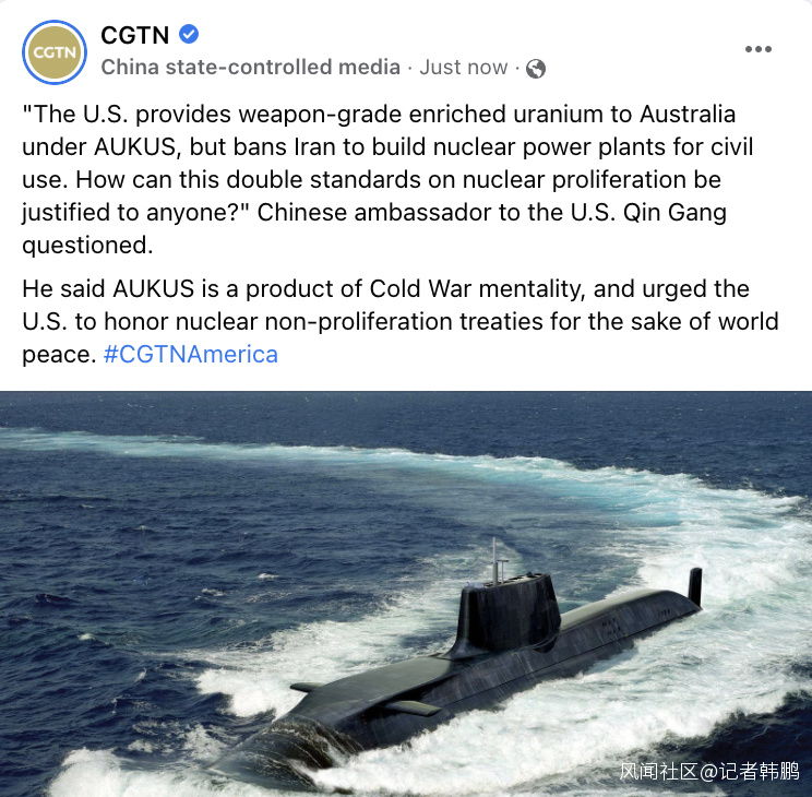 秦剛答:當前,中國面臨更加複雜和嚴峻的國際環境。中美在亞太互動頻繁,維護本地區和平與穩定也是中方的主要關切。我們當然不希望周邊國家對中國抱有敵意。中國是亞太大多數國家的最大貿易伙伴,這也是我們為什麼主張要以政治手段和和平方式解決爭端。但面對挑釁時你希望中方該如何回應,佛系“躺平”麼?AUKUS是冷戰思維的產物,澳大利亞是《不擴散核武器條約》無核武器締約國,但美、英作為擁核國卻向澳轉讓武器級高濃鈾,這對美方多年來努力維護的國際核不擴散體系造成破壞。另一方面,在面對伊朗想要獲得核材料發電時,美國態度截然不同,這就是雙重標準。美一方面擴散核技術和高濃縮核材料,一方面不允許其他國家發展民用核能,這樣如何能説服伊朗和其他國家?