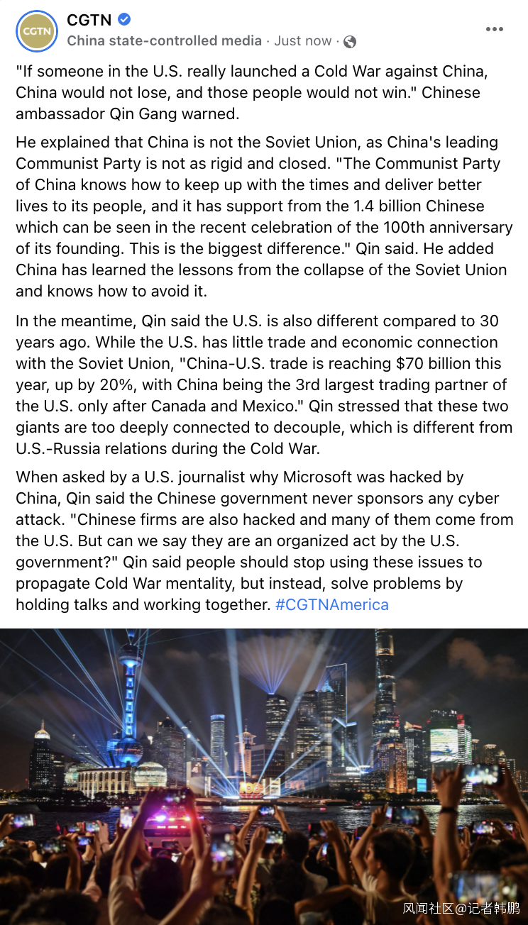 **如果真有人對中國發動冷戰,中國不會是輸家。**那些人也不可能贏得冷戰。首先,**中國不是前蘇聯,中國共產黨也不是僵化的蘇聯共產黨。**中國共產黨是成熟的大黨,剛剛慶祝了百年華誕,過了很精彩的生日。同時它也是風華正茂,鋭意創新、與時俱進,不斷為人民創造更好的生活,也將繼續為世界帶來和平、繁榮和機遇。第二,**中國善於從失敗中學習,從前蘇聯的解體中汲取教訓。**中國一直在研究和討論前蘇聯為何解體。最後也是最重要的一點,中國共產黨贏得了14億人民的衷心擁護。