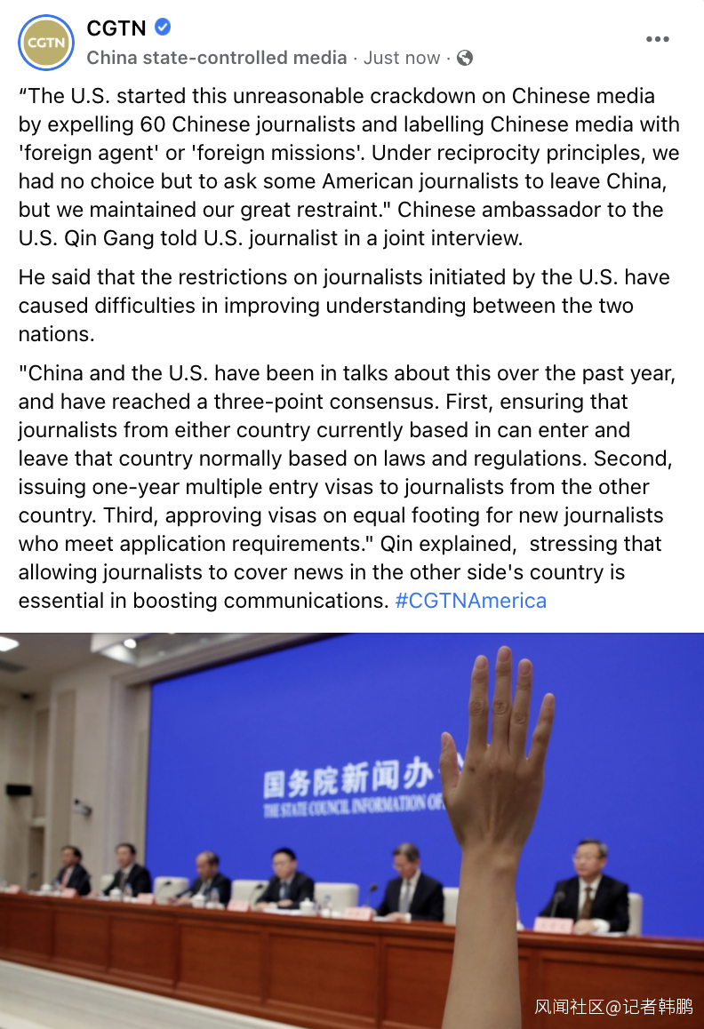 **秦剛答:**首先,兩年前雙方採取措施,起因是特朗普政府利用各種手段打壓中國媒體。中國媒體被貼上“外國代理人”、“外國使團”的標籤,這嚴重影響了中國媒體的日常工作,更有60名中國記者被驅逐出境。**作為反制,中方不得不讓一些美國記者離境,但我們保持了很大剋制。**這對增進中美雙方相互瞭解造成了很大困難,**我們需要記者到對方國家去報道那裏的情況。**過去一年中美雙方一直在談判。在中美元首會晤前夕,雙方就媒體問題達成三項共識:一是在對方國家工作的現任常駐記者可正常進出對方國家。二是同意為對方國家記者頒發一年多次入境簽證並可逐年續簽。三是雙方將為符合申請要求的新任常駐記者對等審批簽證。