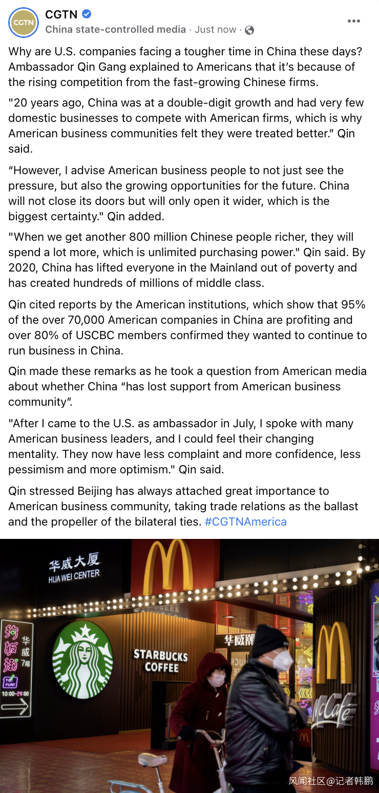 美媒問:如今美國企業對中國的態度發生了變化,你如何看待中國失去了美國商界的説法?