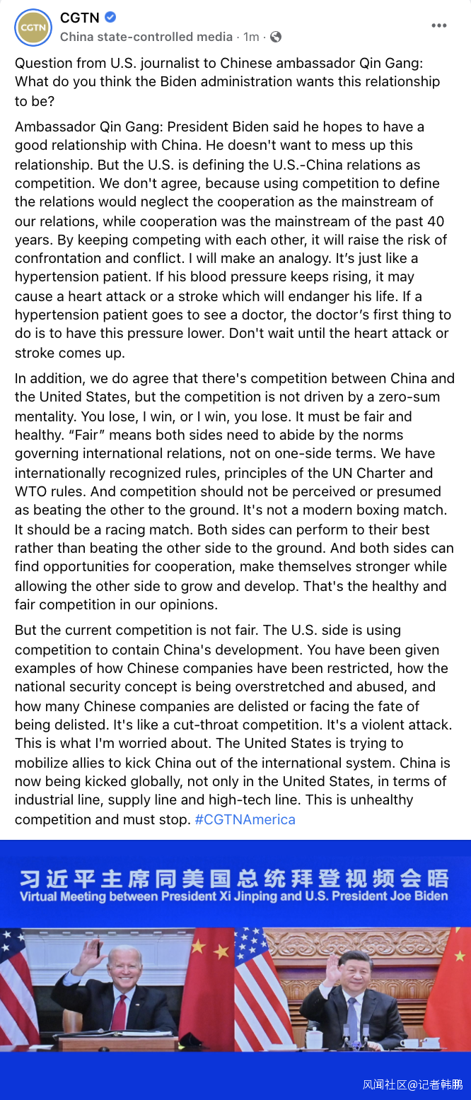 **秦剛答:**拜登總統説,他希望美國與中國保持良好關係,他不想搞砸美中關係。但現在美方把美中關係定義為“競爭”,對此中方並不認同。用競爭來定義關係就會忽視合作因素,而合作一直是過去40多年雙邊關係的主基調。**如果兩國持續競爭下去,就會不斷推高發生對抗衝突的風險。**打個比方,就像高血壓患者一樣,如果血壓持續升高,可能會導致心臟病發作或中風,進而危及生命。高血壓患者去看病,醫生的首要任務就是幫助他把血壓降下來,而不是坐等心臟病發作再開始治療。