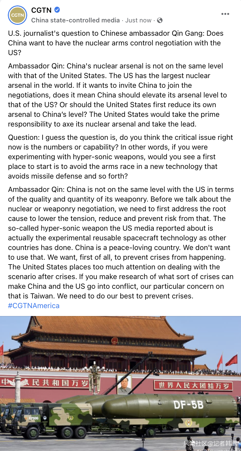 秦剛答:中國武器裝備的質量和數量與美國不在一個層級。在討論核軍控談判前,首先要解決導致緊張局勢的問題,從根本上減少和防範風險。美國媒體報道的所謂高超音速武器,實際上是一些國家都在實驗的航天器可重複使用技術。中國是愛好和平的國家,不想動武。對於中美關係來説,首要的是預防危機發生,而**美國把過多注意力放在危機發生後的應對上。**什麼危機會讓中美陷入衝突?最令人擔心的就是台灣問題,雙方須盡最大努力預防危機。