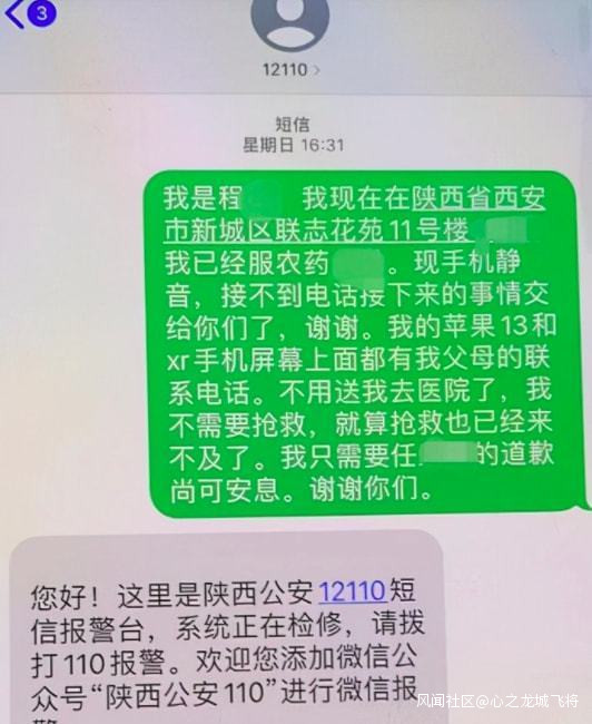同日下午4:31,小程給陝西公安12110短信報警台發了一條短信,“我現在在陝西省西安市新城區聯志花苑11號樓出租屋裏,我已經服農藥了,現手機靜音接不到電話,接下來的事情交給你們了,謝謝。我的蘋果13和 XR手機屏幕上面都有我父母的聯繫電話,不用送我去醫院,我不需要搶救,就算搶救也已來不及了,我只需要房東任某的道歉尚可安息。謝謝你們。”