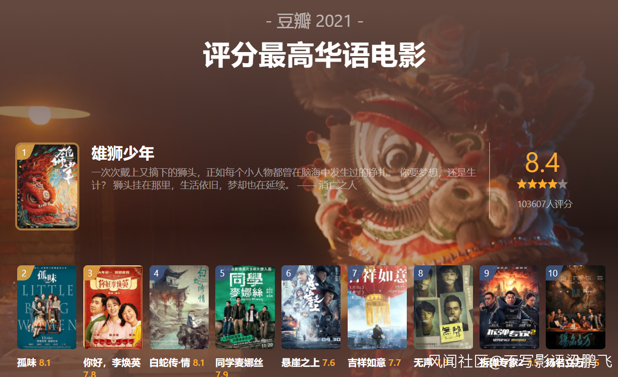 在豆瓣推出的2021年電影榜單中,《雄獅少年》高居第一。