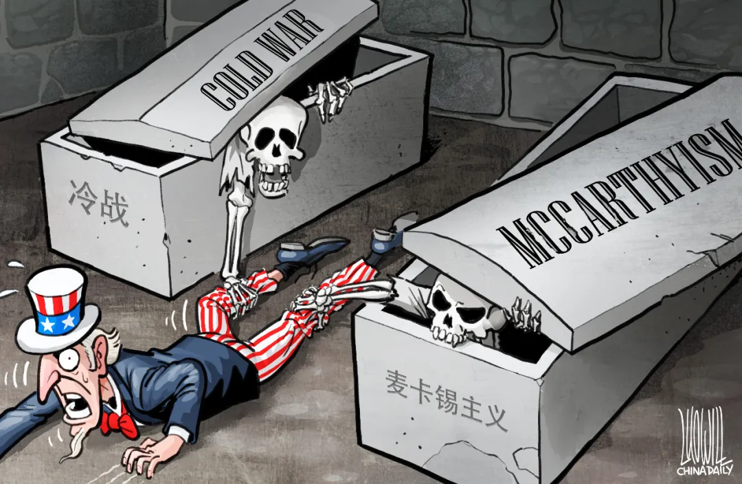 ▲美國看似言論自由,實則處處是“政治正確”的禁言咒。山姆大叔隨時有被冷戰思維和麥卡錫主義拖入墳墓的危險。(漫畫 | 羅傑)