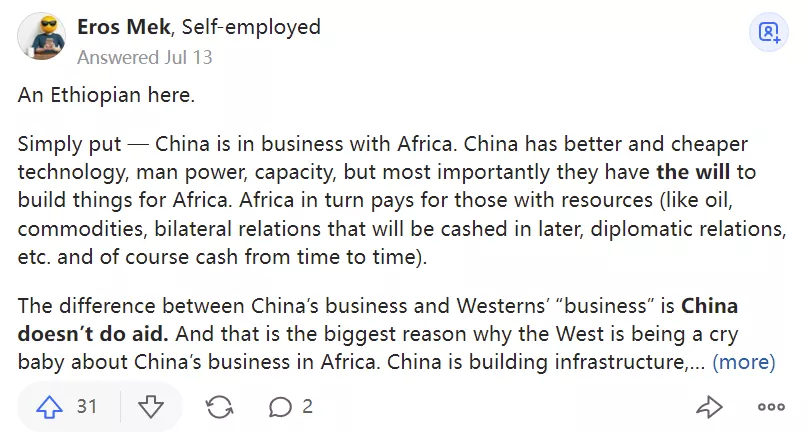 在外網有一個話題:那些抨擊中國幫助非洲的西方人知道真正的非洲人是如何看待中國和他們的"幫助"的嗎?