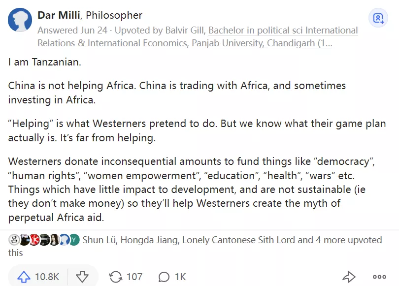 坦桑尼亞網民 Dar Milli 在這個話題下做了回答,並獲得了1w+高贊: