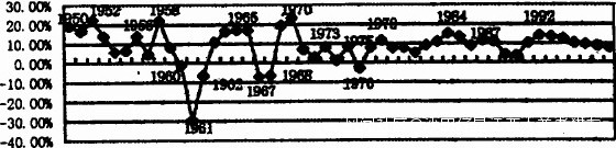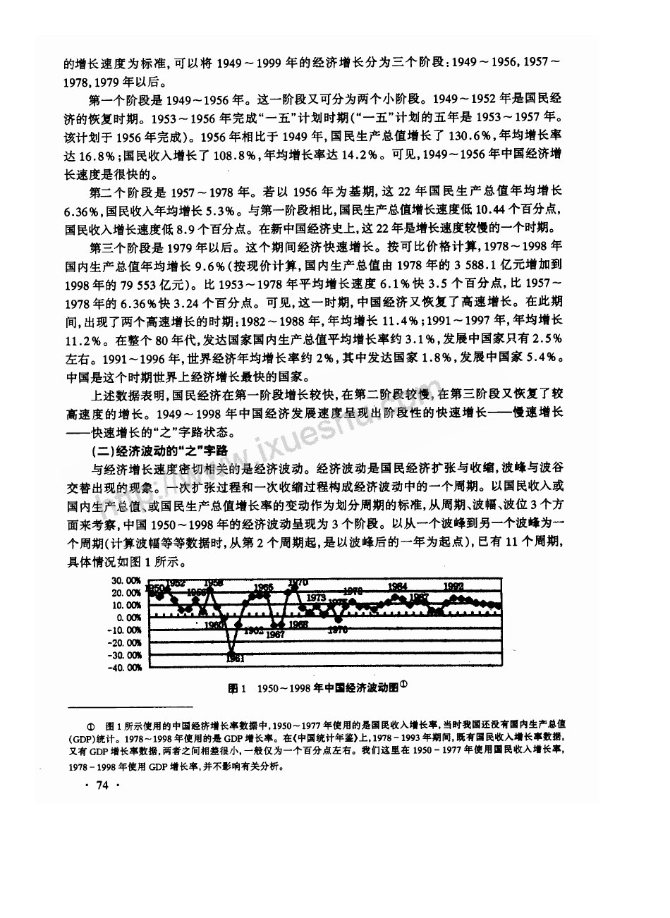 圖1、1950~1998年中國經濟波動圖(注:圖1所示使用的中國經濟增長率數據中,1950~1977年使用的是國民收入增長率,當時我國還沒有國內生產總值(GDP)統計。1978~1998年使用的是GDP增長率。在《中國統計年鑑》上,1978—1993年期間,既有國民收入增長率數據,又有GDP增長率數據,兩者之間相差很小,一般僅為一個百分點左右。我們這裏在1950—1977年使用國民收入增長率,1978—1998年使用GDP增長率,並不影響有關分析)