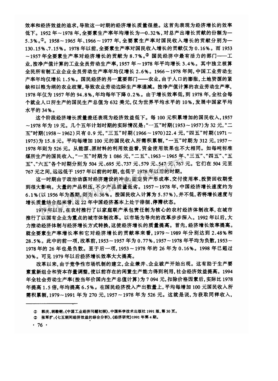 1957~1978年,由於片面追求總產值的增長速度,實行粗放式擴大再生產,忽略了對經濟效率和經濟效益的追求,導致這一時期的經濟增長質量很差。這首先表現為經濟增長的效率低下。1952年~1978年,全要素生產率年均增長為—0.32%,對總產出增長貢獻的份額為—5.3%。(注:郭慶、胡鞍鋼:《中國工業經濟問題初探》,中國科學技術出版社1991版,第30頁)。1958~1965年、1966~1977年,全要素生產率對國民收入增長的貢獻分別為—130.15%、7.15%。1978年以前,全要素生產率對國民收入增長的貢獻僅為0.16%。而1953~1957年全要素生產率對經濟增長的貢獻為8.7%。(注:張軍擴:《七五期間經濟效益的綜合分析》,《經濟研究》1991年第4期)國民經濟中最有活力的部門——工業,按淨產值計算的工業全員勞動生產率,1957年~1978年平均增長3.4%。其中獨立核算全民所有制工業企業全員勞動生產率年均僅增長2.6%。1966~1978年間,中國工業勞動生產率年均僅增長1.5%。國民經濟的另一重要部門——農業,由於人口的膨脹,土地資源的緊缺和以糧為綱的農業政策,導致農業勞動邊際生產率遞減。按淨產值計算的農業勞動生產率,1978年僅為1957年的94.8%,年均每年下降0.2%。由於增長效率低,到1978年,全社會每個就業人口所生產的國民生產總值為632美元,僅為世界平均水平的10%,發展中國家平均水平的34%。