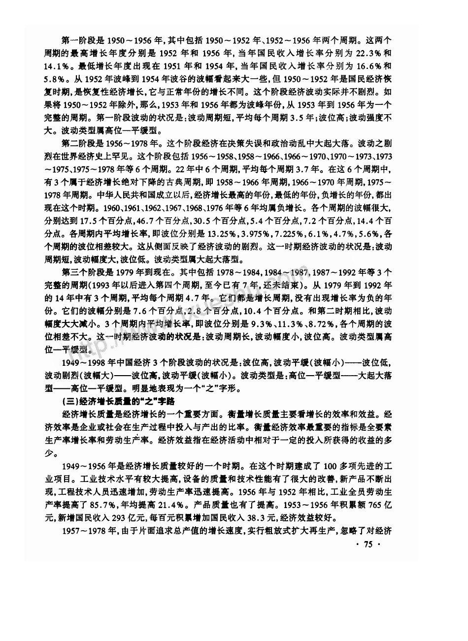 上述數據表明,國民經濟在第一階段增長較快,在第二階段較慢,在第三階段又恢復了較高速度的增長。1949~1998年中國經濟發展速度呈現出階段性的快速增長——慢速增長——快速增長的“之”字路狀態。
