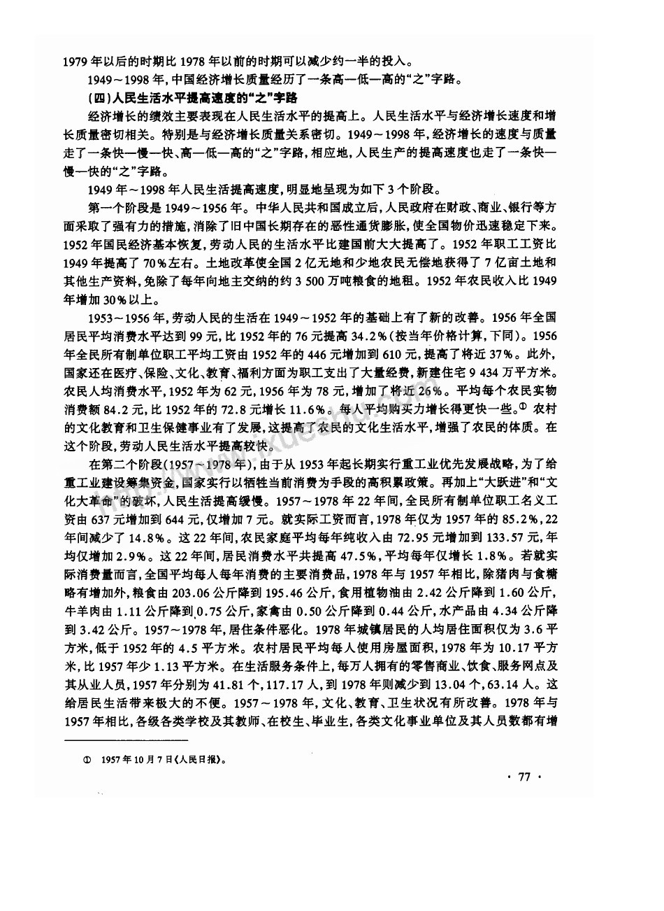 “在第二個階段(1957~1978年),由於從1953年起長期實行重工業優先發展戰略,為了給重工業建設籌集資金,國家實行以犧牲當前消費為手段的高積累政策。……若就實際消費量而言,全國平均每人每年消費的主要消費品,1978年與1957年相比,除豬肉與食糖略有增加外,糧食由203.06公斤降到195.46公斤,食用植物油由2.42公斤降到1.60公斤(樓主批註:就是説,年人均植物油消費量1978年的比1957年大約少三分之一,少33.89%),……家禽由0.50公斤降到0.44公斤,……1957~1978年,居住條件惡化。1978年城鎮居民的人均居住面積僅為3.6平方米,低於1952年的4.5平方米(樓主批註:就是説,城鎮居民1978年的人均居住面積比1952年的小20%)。農村居民平均每人使用房屋面積,1978年為10.17平方米,比1957年少1.13平方米。在生活服務條件上,每萬人擁有的零售商業、飲食、服務網點及其從業人員,1957年分別為41.81個,117.17人,到1978年則減少到13.04個,63.14人(樓主批註:就是説這兩項人均指標的數量分別變少了68.8%和46.1%)”
