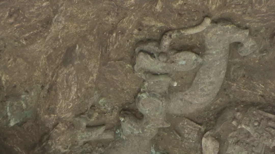 三星堆遺址祭祀區考古工作隊 趙昊:而且這個龍的形態有點奇怪,就是它的頭像一個老虎頭一樣,而且這個耳朵也是這種老虎的圓耳朵。這是這個器物頭的部分,它頭上長着一個比較長的一個犄角,這是它的比較圓的耳朵,眼睛在這裏。這個比較特殊,它是在嘴裏面銜了一個像刀一樣的東西。現在相當於這個龍的側面對着我們。