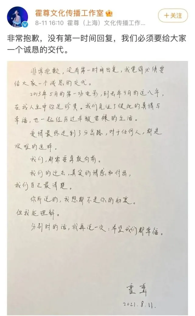 8月11日,霍尊工作室發手寫信回應