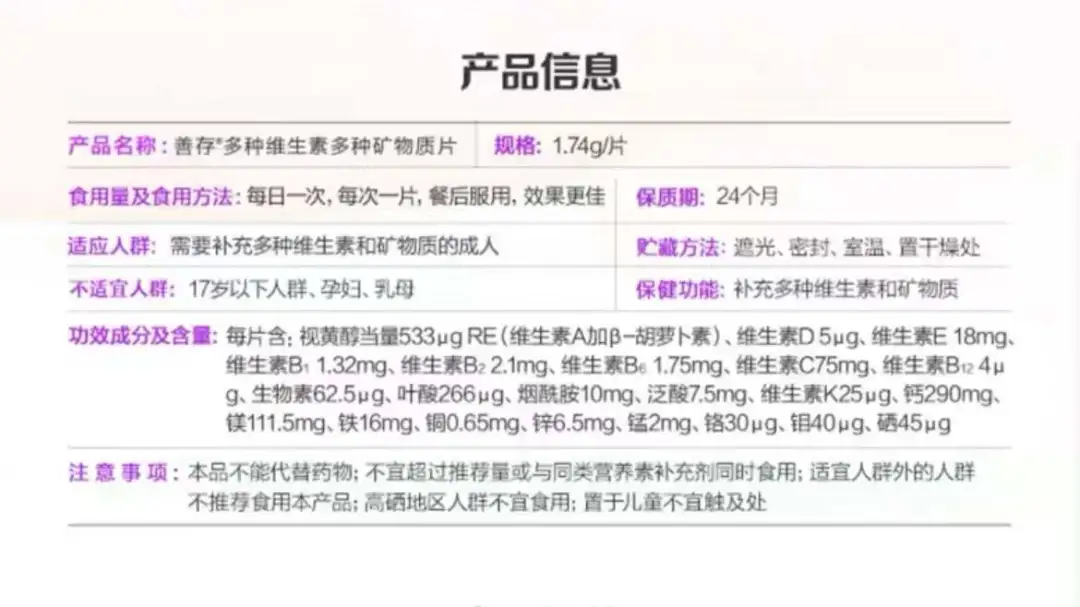 ●對於一般健康人羣來説,營養素含量不是越多越好,尤其要注意脂溶性維生素。如維生素A,NRV%100%就足夠了