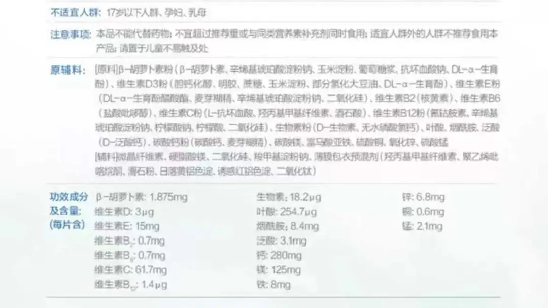 總體上來看,這些複合維生素礦物質補充劑的中添加的其他功效成分大多都較少,作用微乎其微。如果你確實有某個功能性成分的特定補充需求,還不如直接買單一補充劑來得實在。