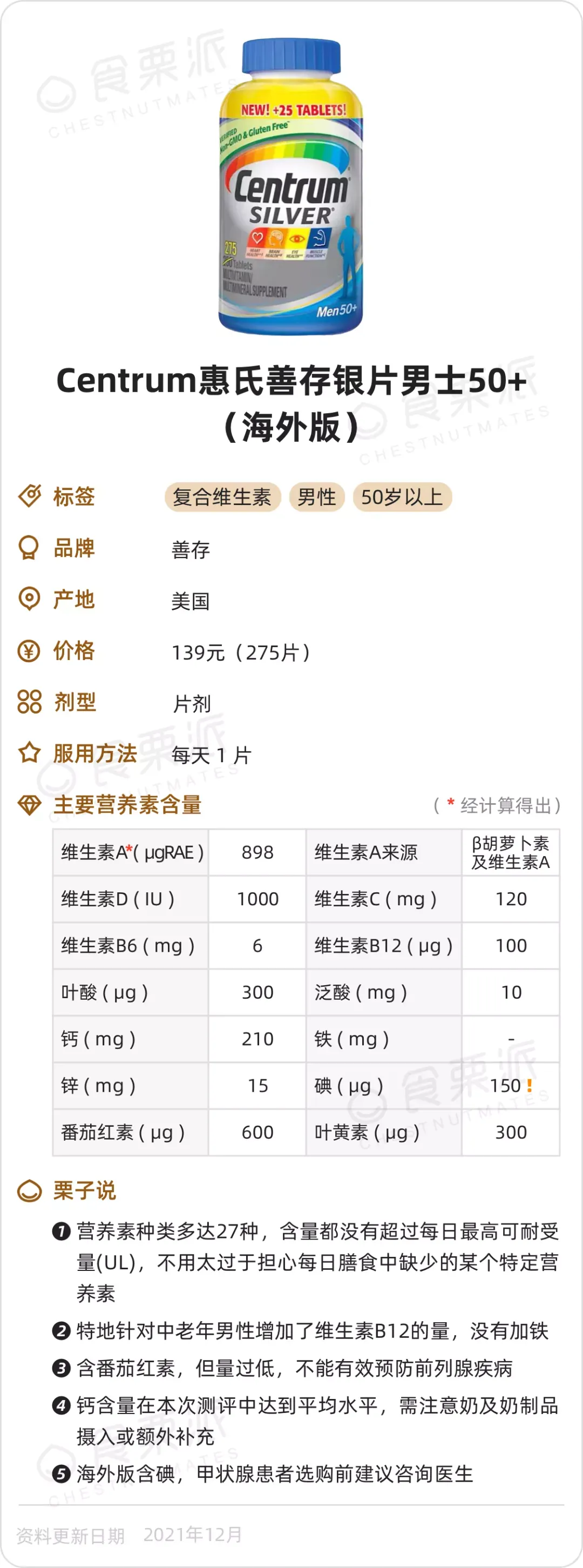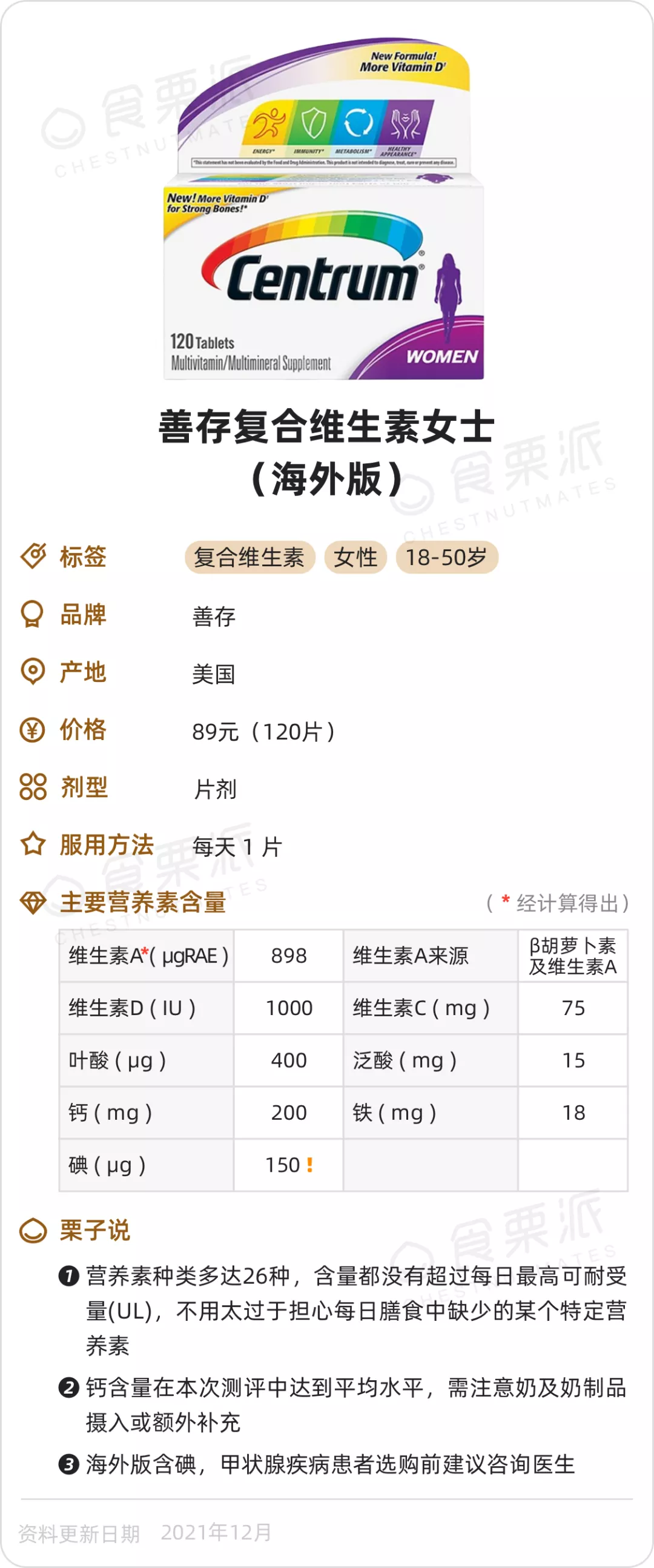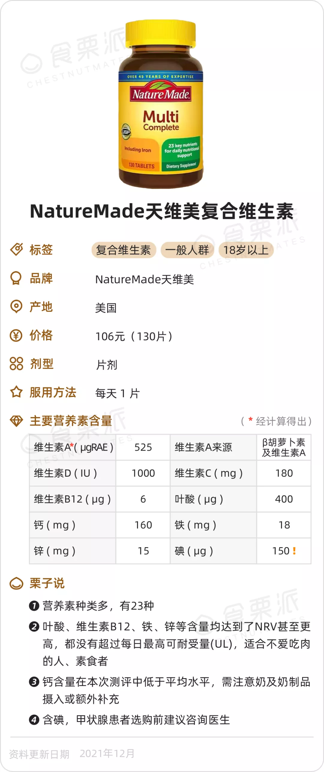 看了一圈下來,覺得這款對素食者、不愛吃肉的人來説,是性價比最高的,比較容易缺的葉酸、維生素B12、鐵、鋅等營養素都兼顧到了,添加量還不算低,價格也是很美膩的。