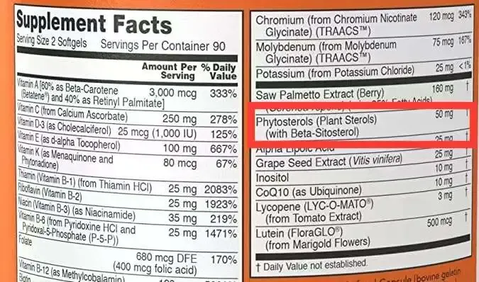 但是複合維生素中植物甾醇的添加量少得可憐,比如N*W*當男士多維軟膠囊中的植物甾醇的添加量才0.05g/d,連最低要求都達不到,還不如去買菜市場買點大豆(植物甾醇含量0.1g/100g)來得實在。