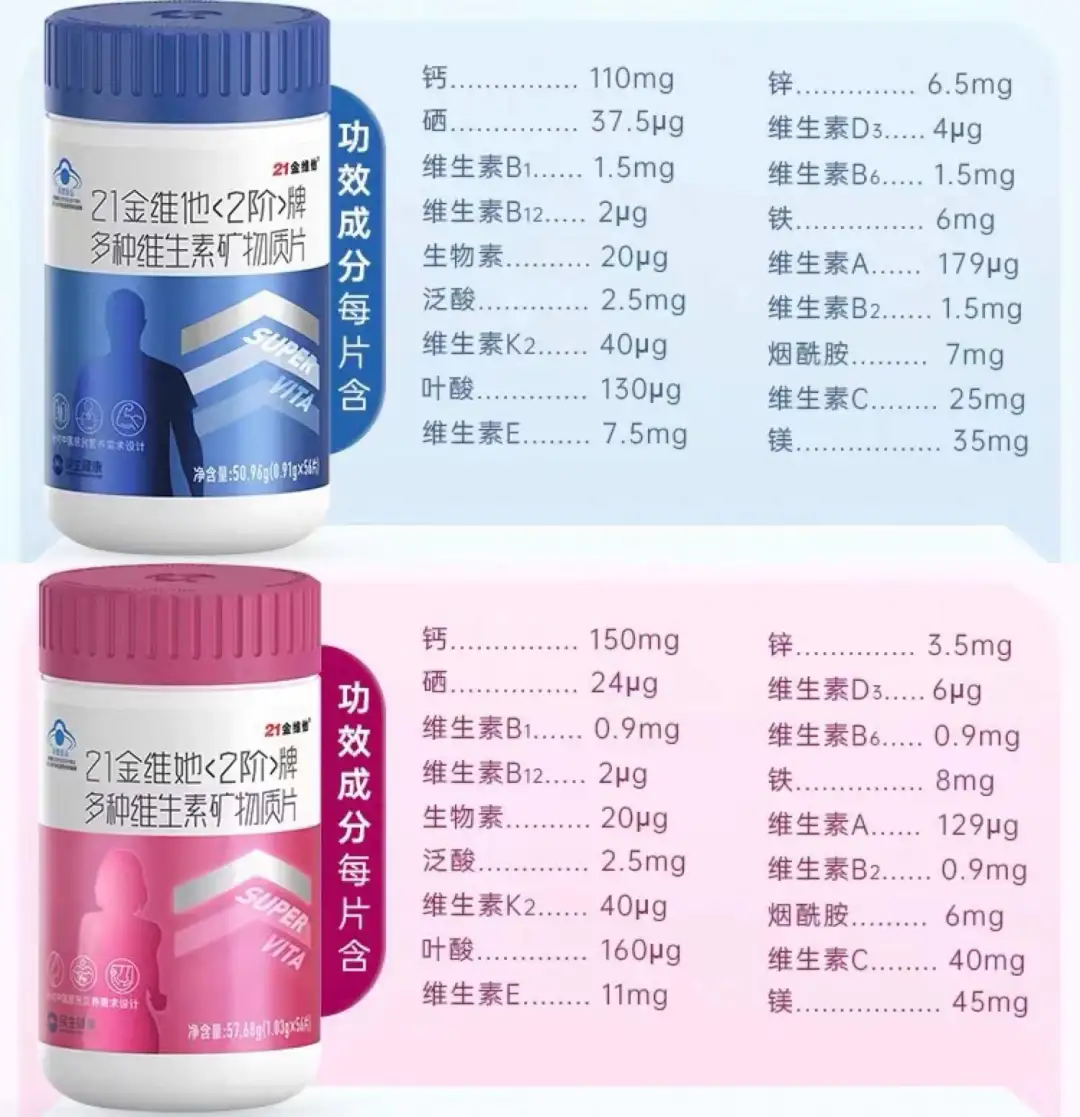 此外,女性複合維生素中的維生素E、維生素C等具有抗氧化成分的營養素加的也比男性多。