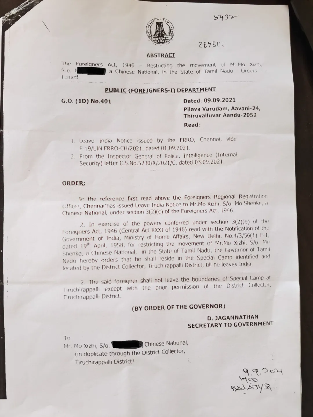我們在商場吃完午飯回家路上就通知了派出所,然而警察直到傍晚五點多才來我家,不同於昨日的是,他們這次徑直把警車開到了家門口樓下。派出所所長親自上樓,出示了一份命令文件。那份命令大致的意思是:由於我違反了《外國人法案》(Foreigner Act, 1946)中第3(2)(c)條款,沒有按照離境通知的要求離開印度,要根據第3(2)(e)條款限制我的行動(restrict movement),將我收押在集中營直至我離境為止。簽署這一命令的落款是邦政府的秘書處,相當於咱們省政府辦公廳直接下達的命令。級別雖然高,但顯然無關於刑事案件,否則的話就該是法院開出的命令了。