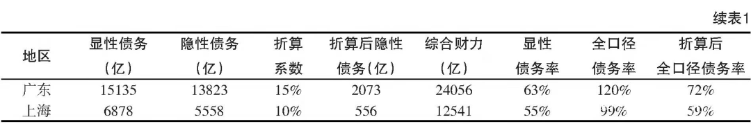 如表1所示,**在納入地方融資平台債務之後,絕大部分地區的全口徑地方政府債務率都顯著上升了。**這表明即便在保守的估計下,地方政府隱性債務依然龐大。其中,天津的折算後全口徑債務率相比於顯性債務率增加了68個百分點,江蘇增加了37個百分點,貴州增加了34個百分點,重慶增加了28個百分點,雲南增加了27個百分點,浙江增加了26個百分點。這意味着上述地區財政負擔的隱性債務相當大。在顯性債務率結果中,16個地區的債務率低於90%,12個地區的債務率位於90%-150%風險控制區間之內,1個地區超出了風險區間上限。而在加入隱性債務之後的折算後全口徑債務率結果中,24個地區的債務率已經進入風險區間,2個地區債務率明顯超出警戒範圍,僅有3個地區債務率是安全的。