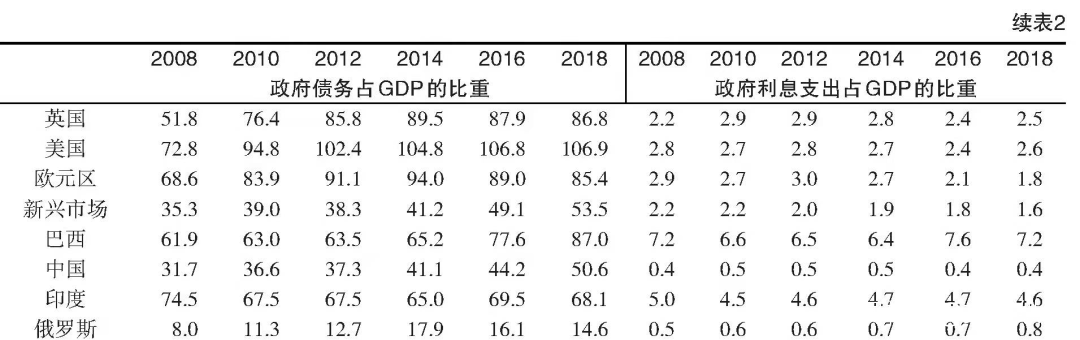表2 有限財政空間:政府債務和付息佔GDP的比重(%)