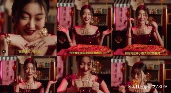 畫外音一個男人訓X一般地“教導”這位笑的一臉諂媚,穿着禮服帶着誇張金首飾的中國女人如何像個文明人一樣“用筷子吃披薩”