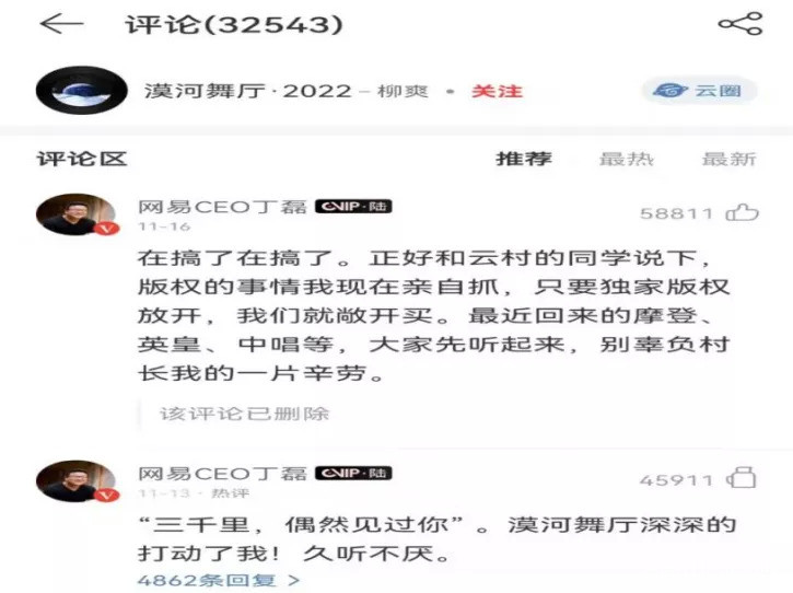 這讓網易雲音樂所面臨的版權壓力有所緩解,丁磊自己也出現在爆火歌曲《漠河舞廳》的評論區中,向用户表達自己對版權的重視,“在搞了在搞了,正好和雲村的同學説下,版權的事情我現在親自抓,我們就敞開買,最近回來的摩登、英皇、中唱等,大家先聽起來,別辜負村長我的一片辛勞。”