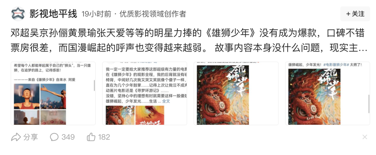卻不曾想《雄獅少年》的野心也頂大的,一些流量明星站台可以理解,但一些自媒體洗地的姿勢真的吃相太難看了。