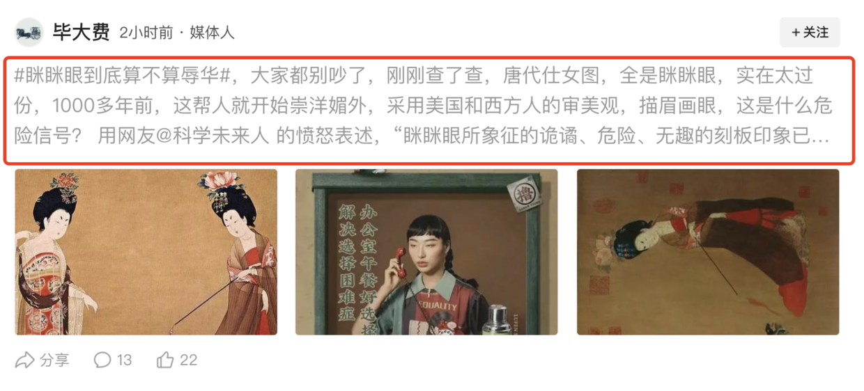 錯的是品牌商家喜歡給模特兒畫上極端的妝容,刻意迎合背後的“眯眯眼辱華文化”。