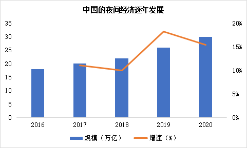 2015年,舊金山的夜間經濟為其帶來60億美元營業額,2017年倫敦的夜間經濟規模高達263億英鎊,我國2020年的夜間經濟規模達到了30萬億元,佔據全國GDP的近十分之三。