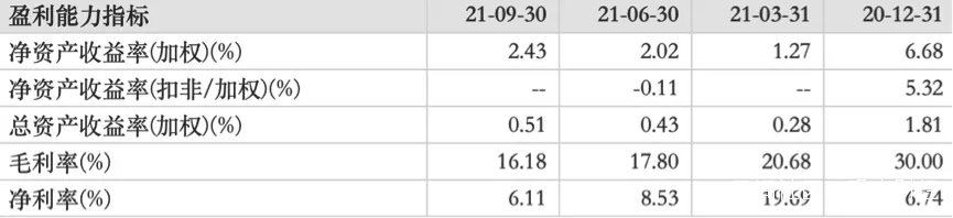 整體銷售表現不佳,也導致信達毛利率及淨利率今年以來持續下降。截至三季度,信達實現銷售金額252.55億元,超過2020年全年,但毛利率卻從年初30%降至16.18%,銷售淨利率也只有6.11%。