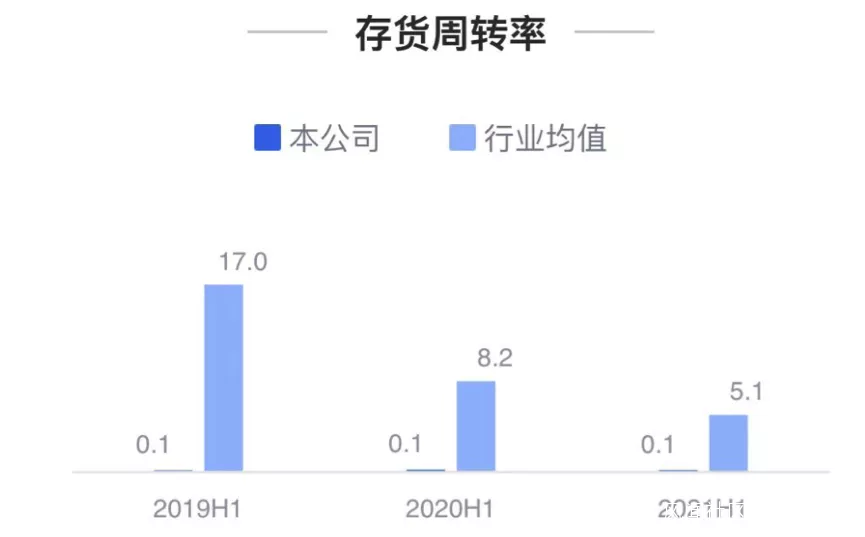 根據新浪鷹眼預警數據,截止到2021年上半年,其存貨週轉率只有0.1倍,大幅低於5.1倍的行業均值。