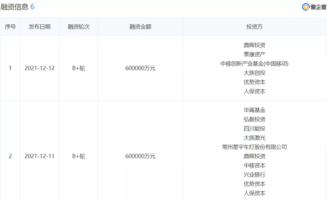 據愛企查數據顯示,2021年2月25日,完成35億元A輪融資;7月30日,完成102.8億元B輪融資;12月12日,完成60億元B+輪融資,投資方涉及小米集團、三一重工、碧桂園、興業銀行、大族激光、星宇股份等知名上市公司。