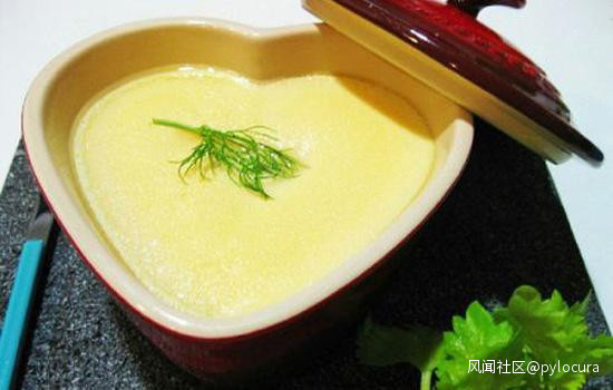 雞蛋羹:把兩個雞蛋磕到碗裏打散,加入適量的白開水,放入適量鹽。用筷子把雞蛋徹底打散,用一個小蓋蓋住,蒸鍋內的水燒開後把雞蛋液放入,中小火蒸。蒸個15分鐘左右拿出,倒入適量醋,加入幾滴香油。在上層撒上一層葱花即可。