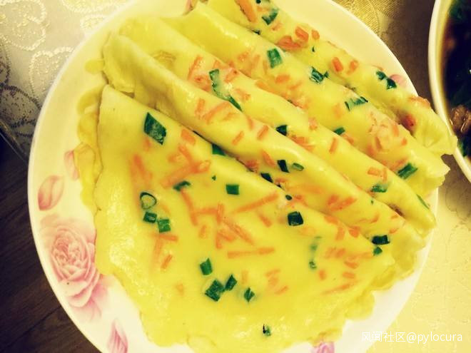 雞蛋餅:將雞蛋磕入碗中,火腿切丁,葱洗淨切成葱花放入碗中,加入適量麪粉、鹽、雞精,倒入適量水調勻,平底鍋裏放入少許油,將調成的糊倒入鍋中小火煎熟即可。