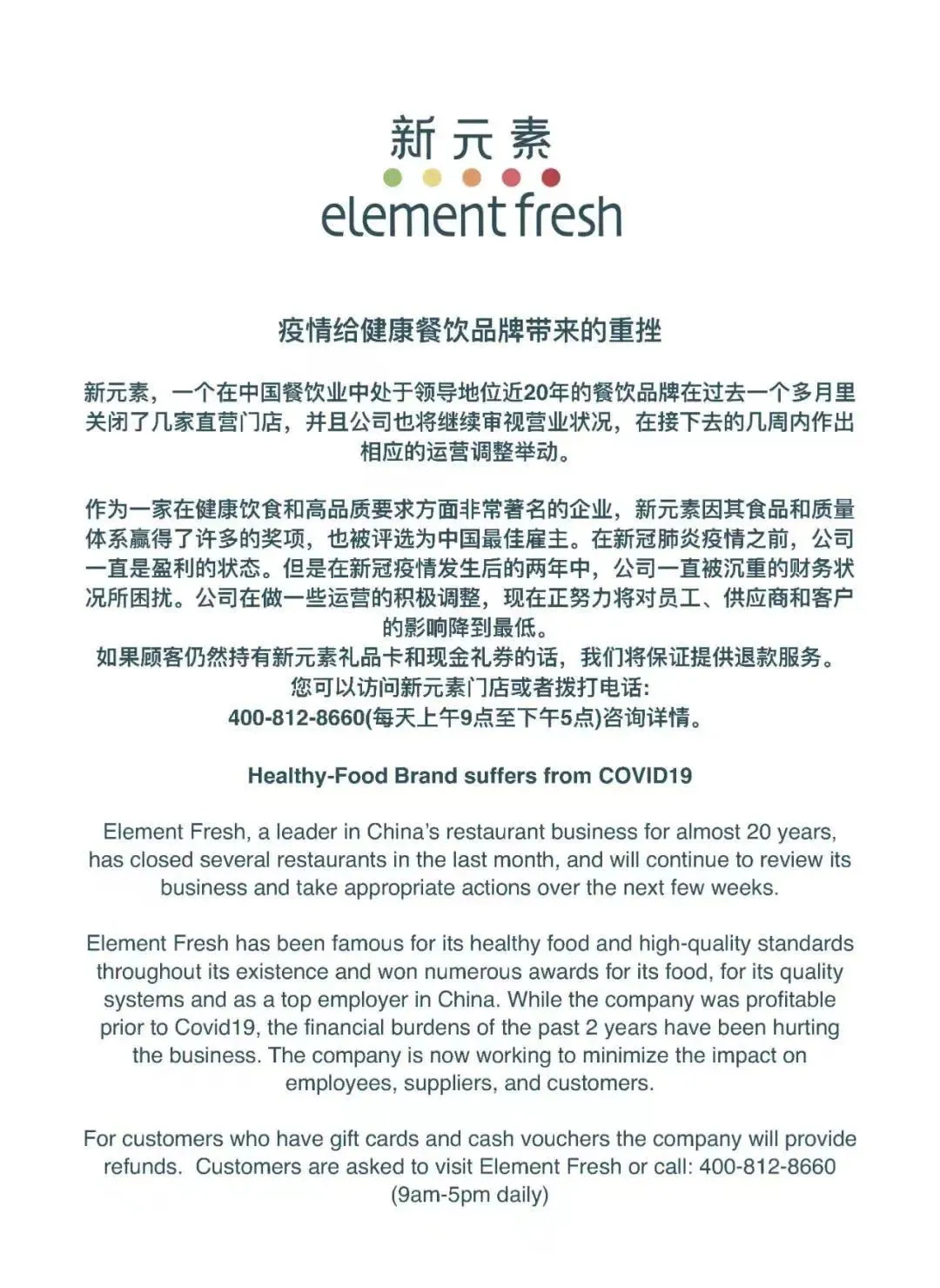 12月20日,新元素通過公眾號發佈寫個新元素粉絲的信,信中指出,公司的財務狀況主要源於疫情的衝擊,現在正努力將對員工、供應商和客户的影響降到最低,並積極推進儲值卡退款服務。