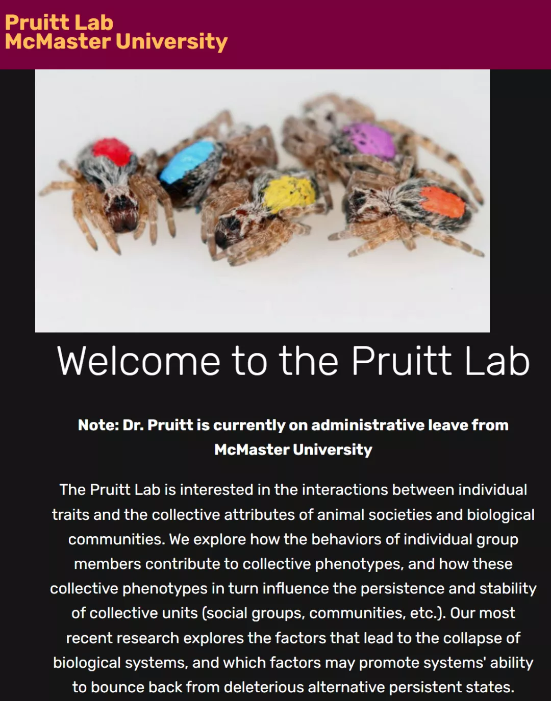 圖4. 著名蜘蛛行為專家普魯特的實驗室網站。網站顯示普魯特正在行政休假,不在學校。 | 來源:pnb.mcmaster.ca/pruittlab