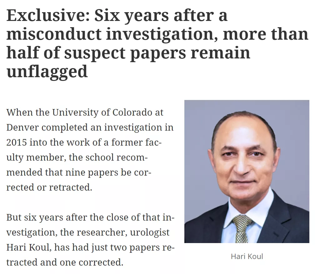 早在2015年,美國科羅拉多大學丹佛分校便發出通告——他們的前教職工哈里·庫爾(Hari Koul)需要修正或撤回9篇含有問題圖像的論文。然而6年時間過去了,絕大多數文章仍安然無恙,許多被牽涉到的期刊甚至聲稱從未聽聞有關庫爾的調查。