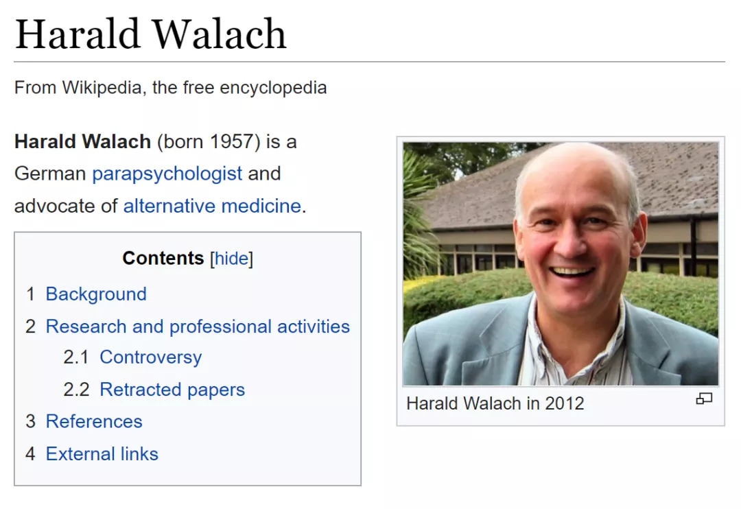 今年六月,《疫苗》(Vaccine)雜誌刊發的一篇論文聲稱“新冠疫苗每預防三例死亡就會導致兩例死亡”(For three deaths prevented by vaccination we have to accept two inflicted by vaccination.),引起了科學界的公憤。《疫苗》雜誌的兩名編輯甚至以辭職來表達抗議。論文作者哈羅德·瓦萊克(Harald Walach)在維基百科頁面的介紹是“超心理學家”,並“擁護替代醫學”(詳見圖3説明)。