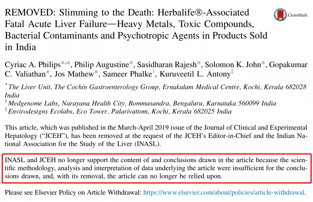 圖5. 撤稿聲明稱《臨牀和實驗肝病學雜誌》(JCEH)和印度全國肝臟研究協會(INASL)均不支持這篇文章的內容和結論[1]。