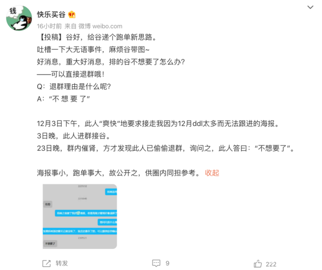 同樣,隨之興起的二手交易市場也常常出現問題,比如微博@快樂買谷 作為該小眾圈子的KOL,就會常常幫助網友們“掛人”,避免購買穀子時上當受騙。