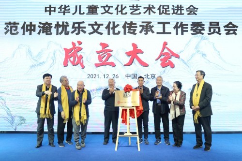 12月26日,“中華兒童文化藝術促進會范仲淹憂樂文化傳承工作委員會”在京成立。原文化部部長蔡武,原海軍副政治委員兼紀律檢查委員會書記範印華中將,國家新聞出版署原副署長梁衡,中華兒童文化藝術促進會會長劉波,國務院扶貧辦原副主任嚴萬鴻,原文化部社文司司長、中國范仲淹研究會高級顧問範崇嬿等相關領導、主辦方有關負責人、文化學者等近百人出席會議。中國國家畫院博士後導師、著名畫家範揚被聘為首任會長。