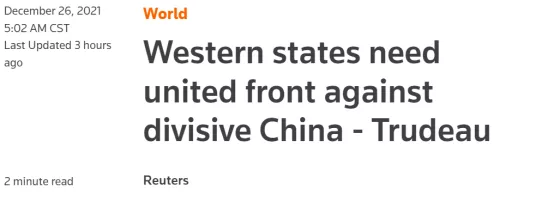 據外媒報道,12月26日,特魯多接受採訪時,將“西方競爭”怪罪到中國頭上,聲稱中國一直在“玩弄”西方國家,並且強烈建議西方國家應採取聯合陣線,防止中國利用商業利益讓它們相互對抗。